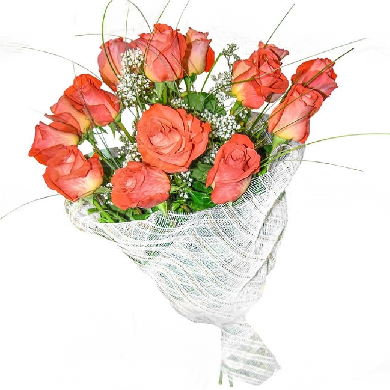 Букет состоит из 13 оранжевых роз, 2 ветки гипсофилы, зелень, красивая упаковка, зелень.