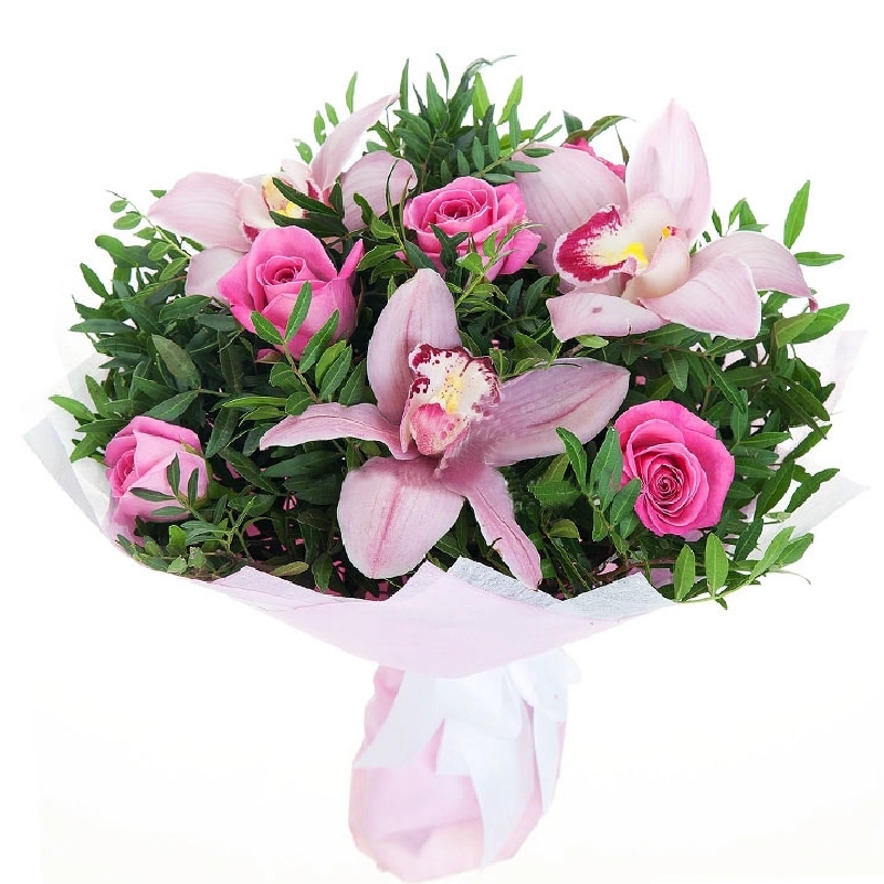 Букет состоит из 6 розовых роз, 3 орхидеи, зелень, красивая упаковка, атласная лента.